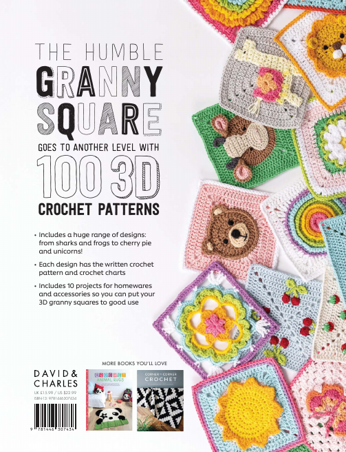 The humble granny square gets a fresh new look in this collection of 100 3D granny square crochet patterns. Choose your favourite from 100 different designs including flowers, animals, food and drink, and motifs; whether it's a fragrant rose, a cherry pie or a jellyfish. Each motif features a 3D element that is integral to the granny square design. There are also ten bright and beautiful projects showing you how to use the squares to make unique gifts for friends and family including an animal themed baby blanket; a fruity cushion and a decorative garland.